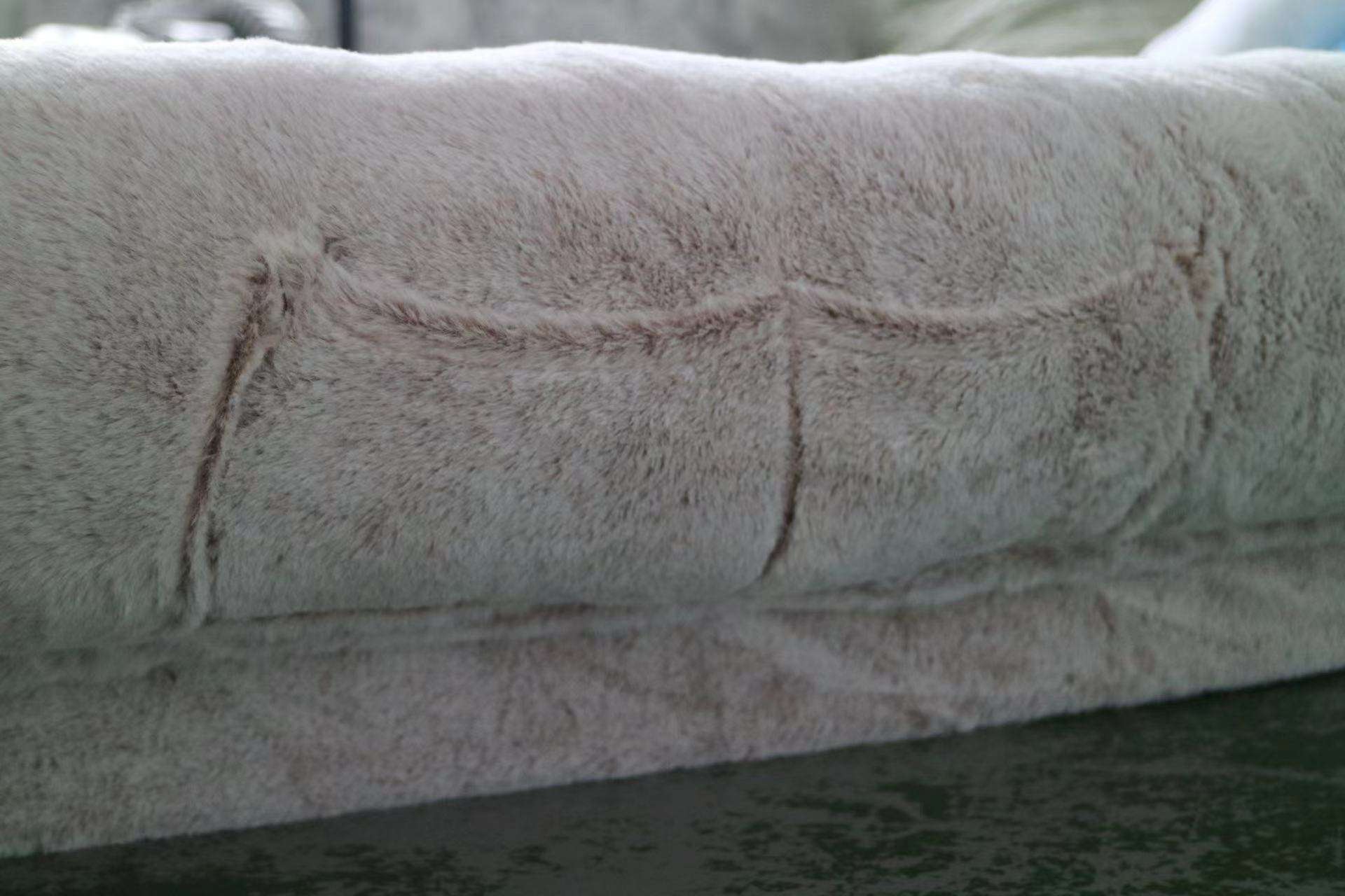 Human-sized 72″x48″x11″ giant dog bean bag bed with soft blanket, removable washable cover, and orthopedic foam for pets or humans.