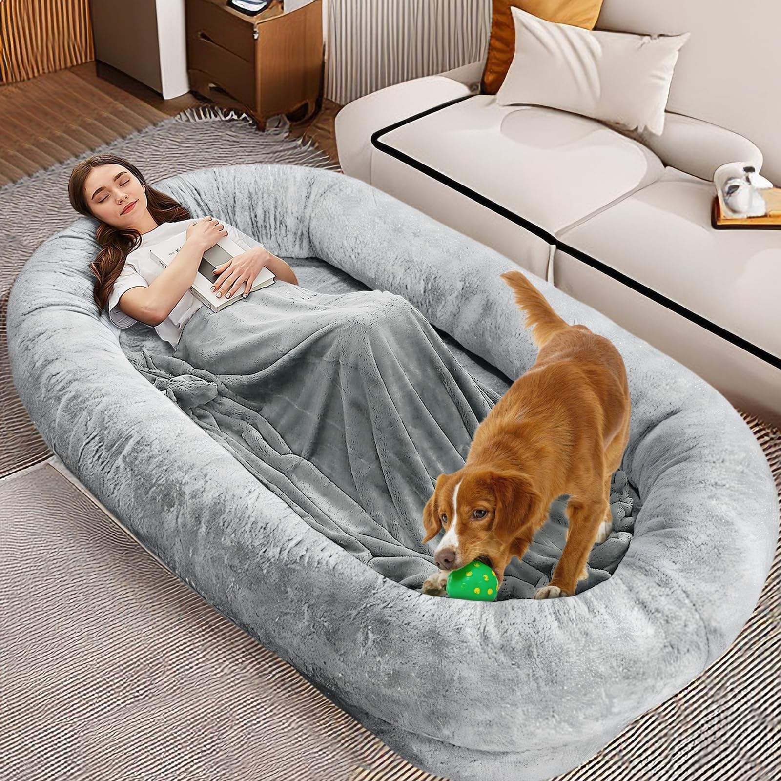 Human-sized faux fur orthopedic bed with soft blanket and pillow, designed for pets and owners to nap together in comfort.