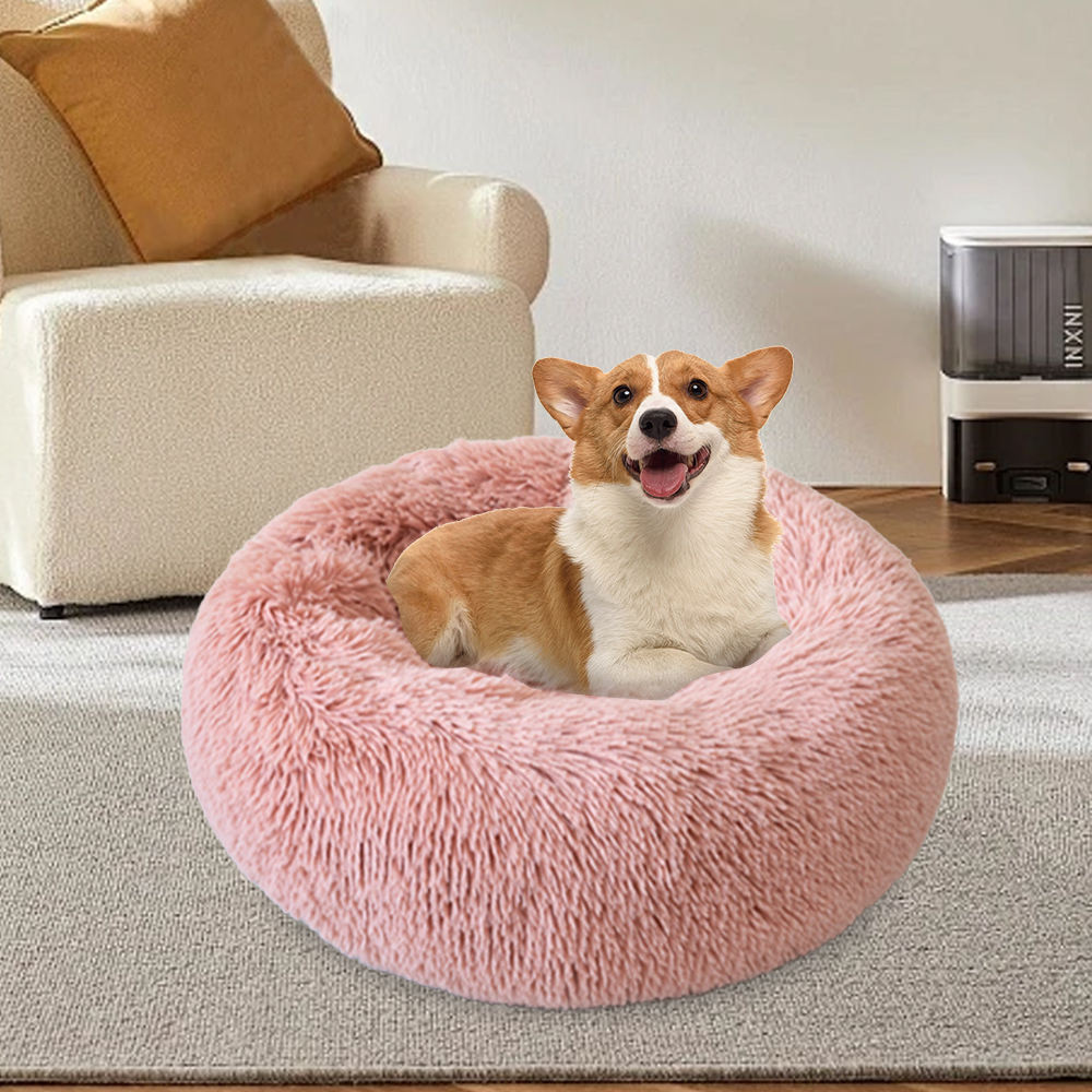 Plush and cozy donut dog bed made of soft faux fur, featuring a non-slip base and warm cushion for dogs and kittens.